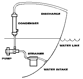 Centrifugal type water pumps offer several advantages over positive-displacement types. They typically run quieter, longer and consume less power. Unfortunately, centrifugal pumps are not very forgiving when it comes to poor installations. If you are installing one of these pumps (or having one installed by someone else) make sure you understand what is required to ensure a good self-priming installation. In the ideal installation illustrated in the drawing below, the cooling water enters the vessel via it's own through-hull located deep on the hull. The incoming water then rises to the sea strainer and continues smoothly uphill to the inlet of the water pump. (The through-hull, sea strainer and pump are positioned so as to remain under the water line and continue this uphill sloping attitude at all angles of heel.) The discharge outlet of the pump points upwards with the connecting hose continuing to rise smoothly into the Condenser Unit inlet. From the Condenser Unit outlet, the connecting hose then continues to a discharge through-hull located above the water line and above the level of the water pump. |